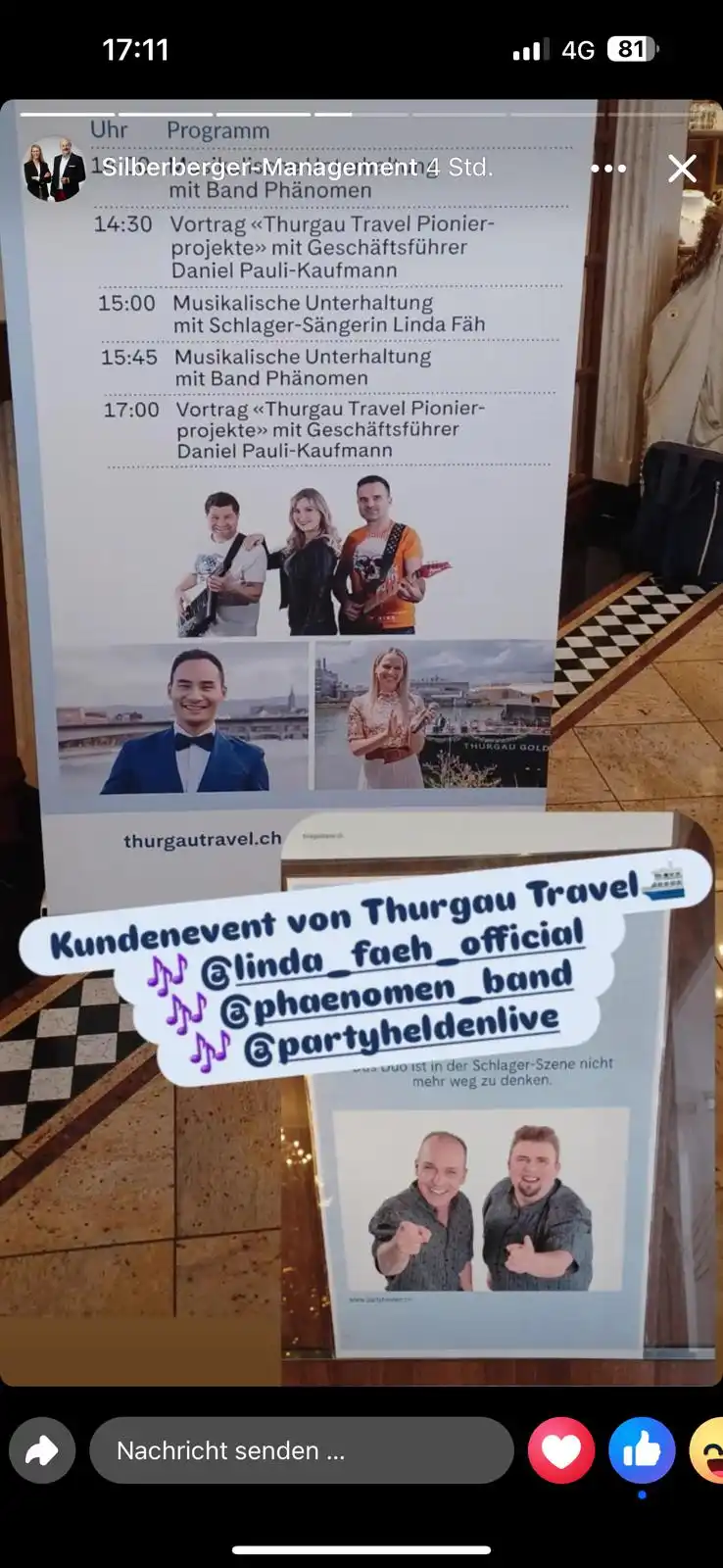 Galerie 📸 (Klicke auf die einzelnen Bilder, um sie größer anzuzeigen.) 28.11.2024 – mit dabei: Linda Fäh & PHÄNOMEN & Die Partyhelden – auf dem Flussschiff – Thurgau Travel / Basel – Strasbourg 22., 23. & 24.11.25 – mit dabei: Eliane Müller & PHÄNOMEN & Johnny Logan – MS Thurgau Gold zurück zur Startseite